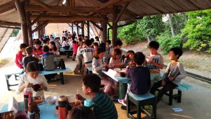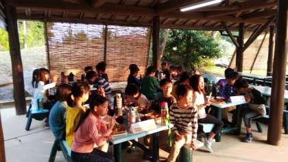 夕焼けの陽を受けながら,みんなで楽しく食事です。