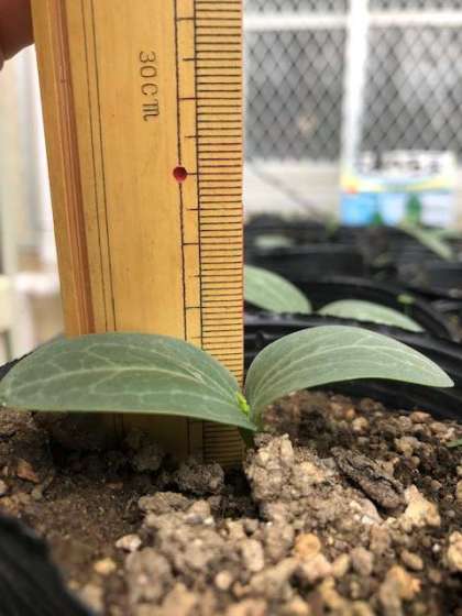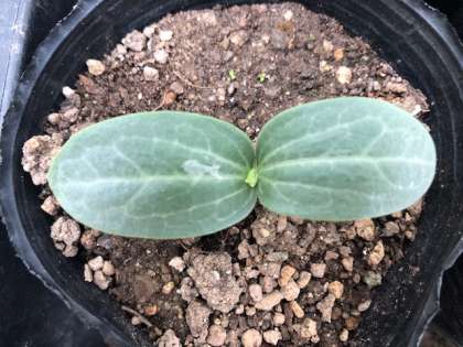 ヘチマの子葉が大きく開きその中からまた何かでようとしています。
