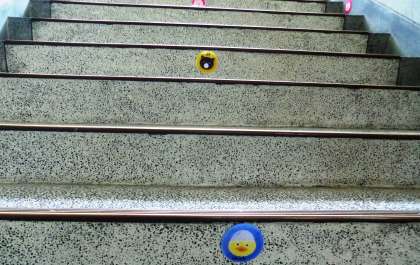 階段には,2メートルの距離を示した動物のシールを貼りました。