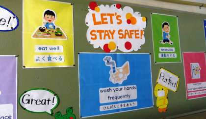 また,英語の掲示板には,英語で感染予防をアピールしています。