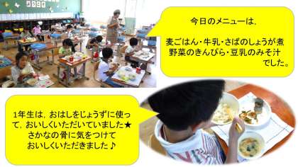 いよいよお楽しみの給食時間です。給食室は,1年生の教室のすぐお隣なので,授業中からいいにおいが漂ってきていたのではないでしょうか?大きなエプロンに身を包んだ給食当番を初体験☆できたての給食は,あたたかくてとってもおいしかったです。初めての給食でしたが,1年生はとても上手に食べていましたよ♪次の給食が待ち遠しくなりますね♪