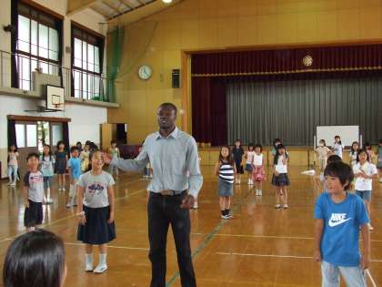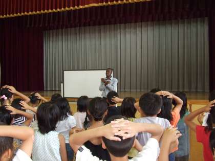 体育館に3年生が全員集合して,初めての英語学習をしました。まず,フランシス・カポン先生の自己紹介。次に英語の挨拶を教えてもらってから,英語を使ったゲームを楽しみました。「サイモンセッズ」「ランチタイムチェイス」など,どの子も大喜びでした。