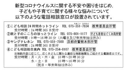 また,不安や悩みを抱える児童や保護者に対して,京都市の相談窓口も設置されていますので,ご確認ください。