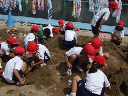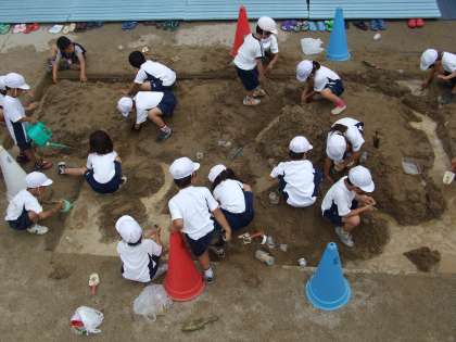 6月24日(水)2組,25日(木)1組が,図工の時間に砂場で造形遊びをしました。はじめは班毎で遊んでいましたが,みんなで山を作ったり,トンネルを作ったり,水を流したりして遊びました。みんな体操服や靴がどろどろになるまで,砂遊びに夢中でした。