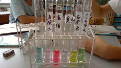 この単元では,食塩水・塩酸・アンモニア水・炭酸水・石灰水等5種類の水溶液を実験を通してそれぞれの性質を知りました。