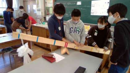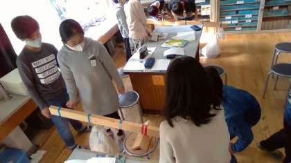 てこの3つの点である,支点・力点・作用点を学び,力点や作用点の位置を変えたときの手ごたえを調べました。