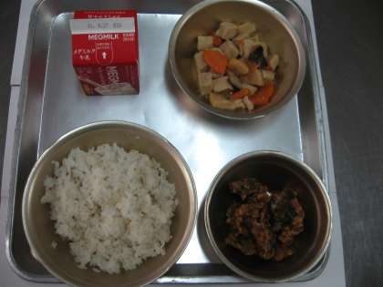 今日の献立は「麦ごはん、牛乳、高野どうふと野菜のたき合せ、いわしのかばやき風」でした。