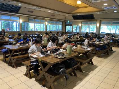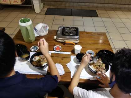 イングランドの丘へ到着しました。ランチタイムです。今日の昼食は,淡路島牛丼です。淡路島牛丼とは,淡路島のお米,淡路島の牛肉,淡路島の玉ねぎを使ったご当地グルメです。黙々,モグモグ,味わっていただきました。