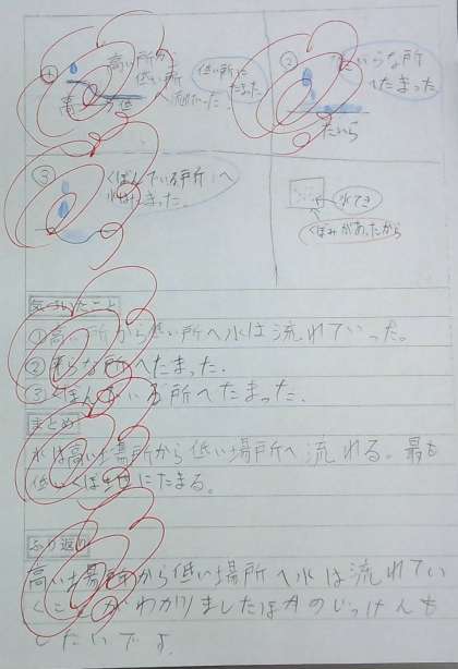 水の流れ方を調べる実験を行いました。実験を行う前から,「水は,高い場所から低い場所へと流れるけれど,平らな場所ではどうなるのだろう。」,「早く調べてみたい。楽しみだな。」といった声をたくさん聞くことができ,子どもたちの実験への関心の高さを感じました。