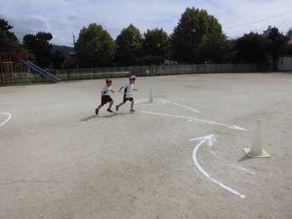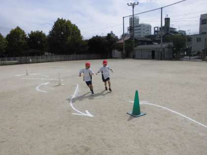 「コーンの近くを走ればいいと思う」「フラフープをすぐに放す」などいろいろなアイディアを実践しています。