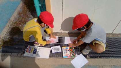 学校内ででこぼこしているところを見つけて,こすってできる模様を楽しんで,作品を作りました。色を一色だけでなく,重ね合わせてできるきれいな色を見つけている人もたくさんいました。できた紙から何に見えるか想像し,その形に切って画用紙に貼っていきました。