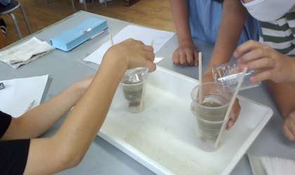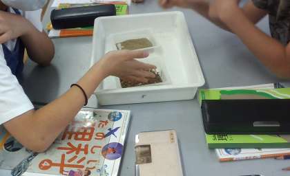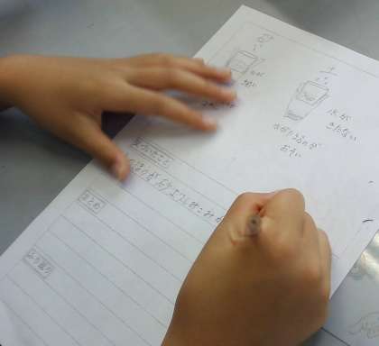 水が,地面にしみこむのか実験を行いました。雨の日の運動場の様子と砂場の様子に違いがあることから,運動場の土と砂を使って水のしみこみ方を比べてみました。予想では,水は運動場の土の方がしみこみやすいと考えていた子が多かったのですが,実際に土や砂をさわったり,水がしみこむ様子を観察したりすることで,粒の大きい砂の方が,水が速くしみこむことを理解しました。