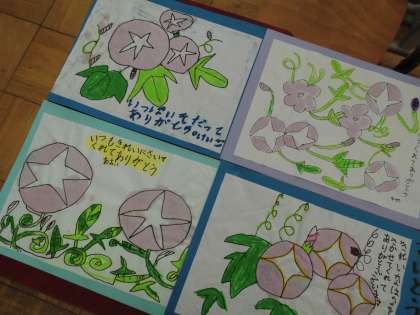 昨日,朝顔のいろみずあそびで書いた絵を,画用紙に貼り付けて完成しました。とっても素敵な作品ができました。