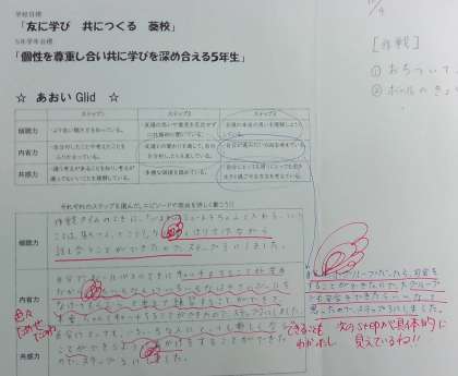 これまでの体育科での「オリンピックリレー」振り返りを午後にしました。まずは,体育科の技能面での振り返り。自分やチームの課題に対して,どのように練習を工夫したか。そして後半は,葵小学校の学校教育目標「友に学び 共につくる葵校」に向かうための力『傾聴力・内省力・共感力』を自己評価表〔あおいGlid〕で振り返りしました。