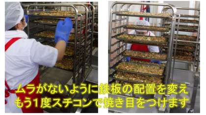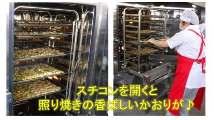 今日は,スチコンメニューの日でした。鶏肉と白ネギをスチームコンベクションオーブンで調理すると香ばしい焼き目のついた照り焼きができあがります。これまでにない調理方法なので,調理員さんもドキドキです。新メニューの登場に,子どもたちからは歓声があがっていました♪