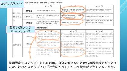 今日は,まず前回までの探究活動のルーブリックとグリッドを振り返りました。そこから改善点を確認し,さらに探究したいことを出し合い,グループの次の課題を決めました。