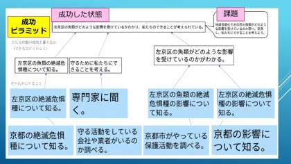 改善点の中で,「活動計画をもっとしっかりしたい。」「役割分担が決めた方がよい。」「仮説とずればないようにもっと交流が必要だ。」といったものが出たので,今回は『成功分解シート』を利用しました。課題が成功した状態を想定し,それが達成できるためには何をどうすればよいのか,やるべきことを細分化していく活動です。なかなかアイデアが思いつかないチームは,他のチームからアドバイスをもらいながら進めることができていました。