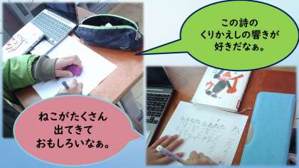 くりかえしの言葉を楽しんだり,内容を想像したりして,自分の好きを見つけることができました。