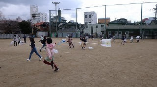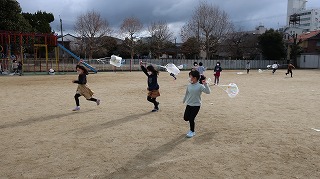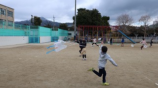 1年生では,生活科の「ふゆと ともだち」で,冬の遊びに取り組んでいます。ビニール袋に絵を書いたり,スズランテープを引っ付けたりして,それぞれオリジナルの凧を作りました。今日はあまり風が吹いていませんでしたが,校庭を走りまわって楽しく遊ぶことができました。