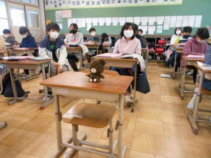 そして今日はスペシャルゲストが…!クマのぬいぐるみです。クマが色んな場所に移動する度に,It's on the desk.やIt's in the box.などクマが置かれている場所に注意して話すことができました。「もしここにいたら…underかな?」などと自分で考えてつぶやく姿も見られました。また次の時間もモノの場所をたずね合って表現をたしかめていきます!