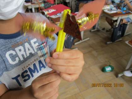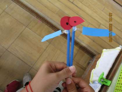 太さの違う2種類のストローを使って、動く仕組みを作り、何に見えるか想像して作りました。仕組みが出来上がり、動かしてみると、「うわー羽みたい。」「脚が動いてるみたい。」など,それぞれ思い浮かんだことを作品に表していました。