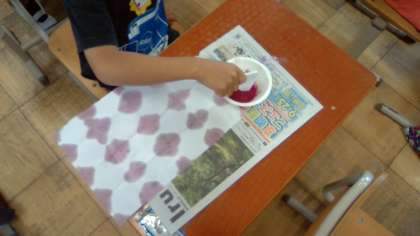 生活科であさがおの色水遊びを行いました。あさがおの花を絞って作った色水で、半紙を思いのままに染めました。子どもたちは「どんな模様になるのかな」と試しながら取り組み、様々な色の濃さや模様になりました。自分であさがおを育てることを通して、いのちの大切さを感じたのではないでしょうか。