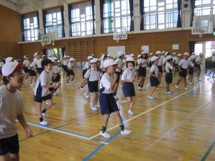 10月のスポーツフェスタで発表するダンスを初めて踊りました。最初は,先生が踊っているのを見て「難しそうだな。」「覚えられるかな。」とちょっぴり不安そうな表情の子どももいました。でも、踊り始めると、軽快な曲のリズムにのることが楽しくなり、笑顔がいっぱいになりました。曲は「ポポポポーズ」。歌詞も楽しくて、元気でかわいい2年生の子どもたちにぴったりです。次回の練習では、「ツバメ」という曲に合わせて踊ります。どうぞご期待ください!