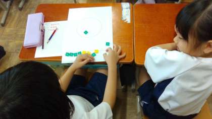 「2こはいって、8こはずれちゃった。」「5と5で10だった。」と、楽しく10の合成・分解について学習しました。