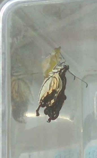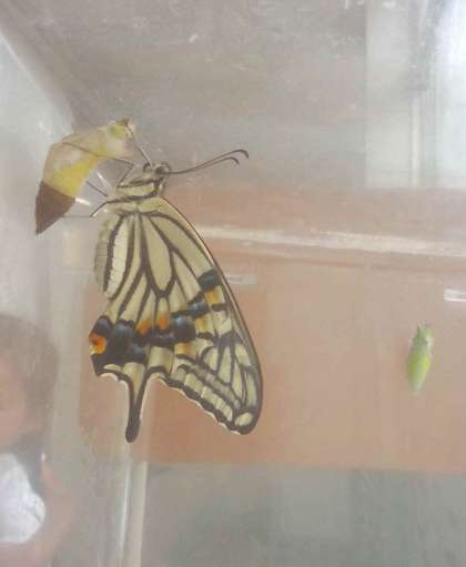 たまごから観察を続けていたアゲハチョウ。幼虫のために、生き物係さんが「イチロウは食いしん坊なので、葉が足りません。みかんの葉っぱがある人は、もって来てください。」と呼びかけるなど、みんなで成長を見守っていました。脱皮を繰り返し、さなぎになり、ついに今日、さなぎから出てきました‼運よく、さなぎから出る瞬間を見た子どもたちからは、「Happy birthday イチロウ♪」の合唱が始まりました。素敵な時間でした。