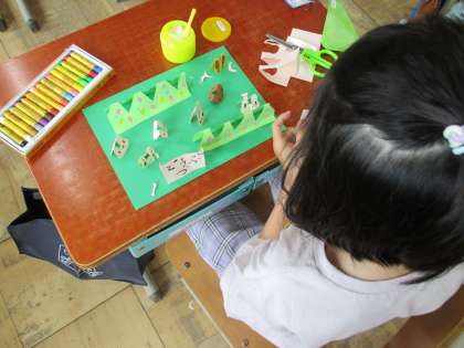 はさみで切ったり、クレパスで色を塗ったりして
