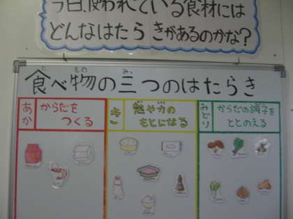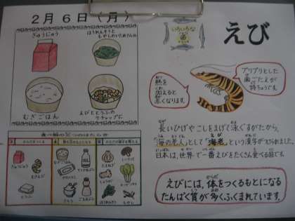 今日は、「えび」の豆知識について話をしました。長いひげや腰をまげて泳ぐ姿から、「海の老人」として「海老(えび)」という漢字が当てられました。えびには体をつくるもとになるたんぱく質が多く含まれています。熱を加えると赤くなり、プリプリとした歯ごたえが特徴です。日本は、えびを世界で一番たくさん食べる国です。