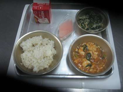 今日の献立は、「麦ご飯、牛乳、えびと豆腐のケチャップ煮、ほうれん草ともやしのいためナムル、三色ゼリー」でした。