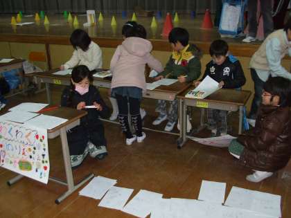 町探検クイズやさんや,おもちゃ作りやさんなど,色々なお店をしました。準備のときから2年生はわくわくしながらお店を作りました。また,国語科の学習「しかけカードの作り方」から,しかけカードを再度作って,1年生へ招待状をおくりました。
