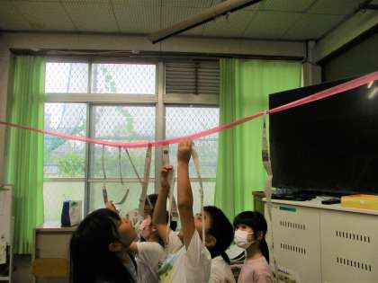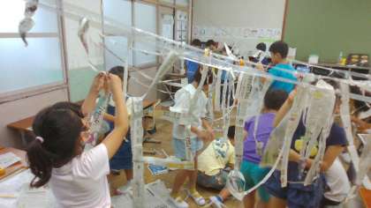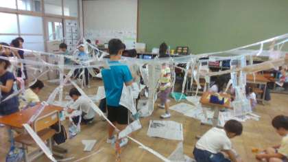 今日の学習では、細く切った新聞紙やチラシをつないだりつるしたりしました。お友だちのところにつないでみたり、高いところからつるしてみたり、さまざまな工夫が見られました。「くもの巣みたい。」「こんなに長くつながった。」と、つなぎ合わせてできる形を楽しみながら取り組んでいました。