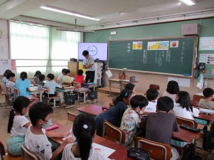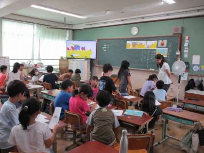 3年生は、道徳の学習でした。リンゴをもっていったサルの行動だけを見ると悪いように見えるけれど、実はサルには2匹の赤ちゃんがいた…。見えるところだけで判断してはいけないと気づいた子どもたちでした。授業の冒頭で登場したおいしそうなリンゴ。先生から「欲しい?」と尋ねられると、もちろんみんな「欲しい!」でも、見えていなかった裏側には先生がかじった跡が…。お話と現実をつないだドラマチックな展開でした。