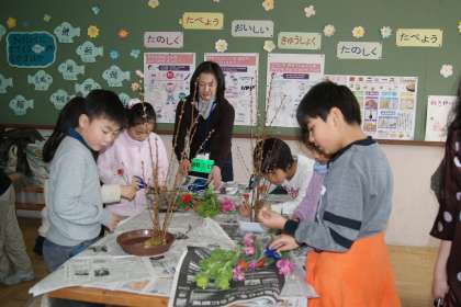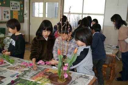 華道の先生にゲストティーチャーとしてきていただき,お花の生け方を詳しく教えていただきました。