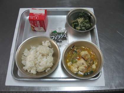 今日の献立は、「麦ごはん、牛乳、五目どうふ、ほうれん草ともやしのいためナムル、じゃこ」でした。ご飯によく合う献立で野菜がたっぷり入った五目どうふは、あつあつで身体もあたたまります。子どもたちは、みんなよく食べてくれました。