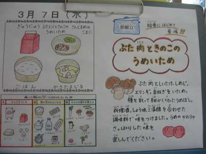 豚肉ときのこの梅いためは、新献立です。ビタミンBが多く含まれている豚肉と、きのこを、梅肉・酒・しょう油・三温糖を合わせた調味料で味付けをしたいためもので、さっぱりとしていて、ごはんに合うおかずです。きのこ類は、熱を加えると水分が出ます。強火で一気にいためることで、エリンギのコリコリした歯ごたえが楽しめるように気をつけながら調理しました。