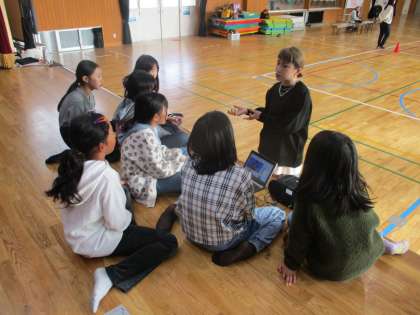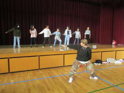 体育館の舞台を広く使うこと、フォーメーション、振りと振りの間の動きで元気よさを伝えることなどを教えていただき、さらにレベルアップしたダンスパフォーマンスになりました。