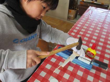 強く打つとくぎが曲がってしまい,まっすぐ打つのが難しいですが,失敗したらくぎを抜いてやり直し,根気よくがんばっています。
