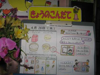 今日は、みんなの大好きなカレーでしたね。給食では、ルーも手作りなので、小麦粉をこがさないようにじっくりといため、脱脂粉乳やバターを入れてこくのあるなめらかなルーを作ります。みんなが楽しみにしているカレーなので、調理員もみんなの喜ぶ姿を想像しながらはりきって作っています。
