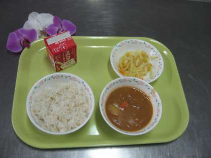 今日の献立は、「麦ごはん、牛乳、カレー、野菜のソティ」でした。
