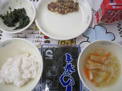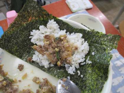 ごはんと肉みそ納豆をのりで巻いて食べました。