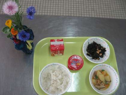 今日の献立は、「牛乳、麦ご飯、煮つけ、ひじき豆、りんごゼリー」でした。