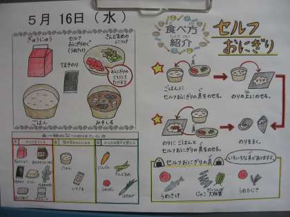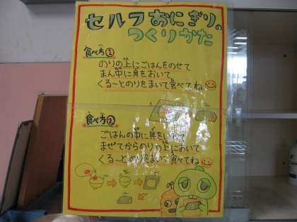 今日は子どもたちにセルフおにぎりの食べ方の説明をしました。梅さけの具をごはんによくまぜてから、のりに“くるりん”とまいて食べてね!!と話をしました。