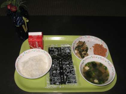 今日の献立は「セルフおにぎり(うめさけ)、牛乳、三度豆の煮つけ、みそ汁」でした。