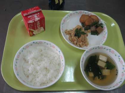 今日の献立は、「たけのこごはん、牛乳、平天の煮つけ、すまし汁」でした。