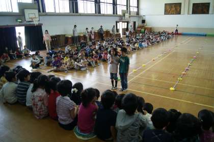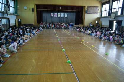 2年生から6年生の人に見守られ,体育館の舞台に