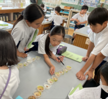 1年生からの学習で、種まきはいつも『春』にしてきたことから、なぜ『春』なのか…「春はちょうど気温がいいのでは。」「夏の日光が成長に必要だと思う。」などの予想から、「植物の成長には、何が必要なのか。」という課題を立てて、調べています。