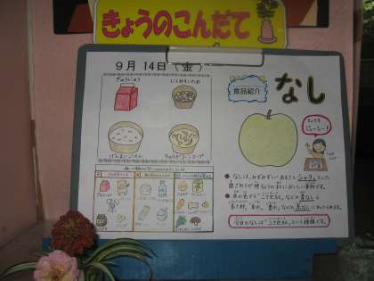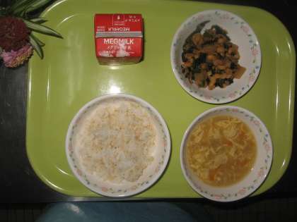 今日の献立は、「玄米ごはん、牛乳、肉みそいため、中華コーンスープ」でした。